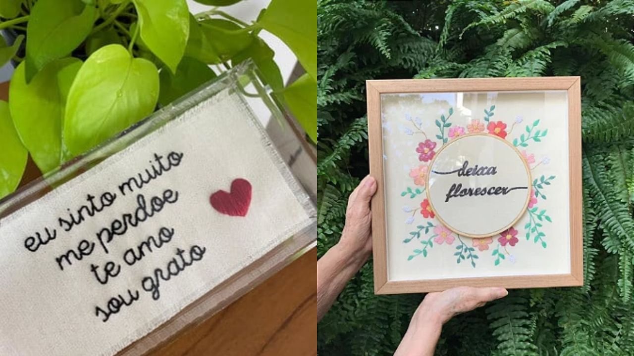 Esse guia cobre o processo completo, desde a escolha do tecido e transferência do texto até os pontos mais indicados para letra e o acabamento que deixa o quadro pronto para pendurar.